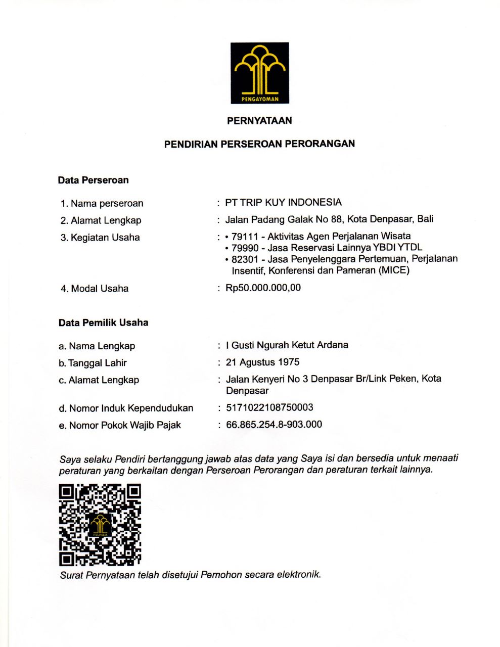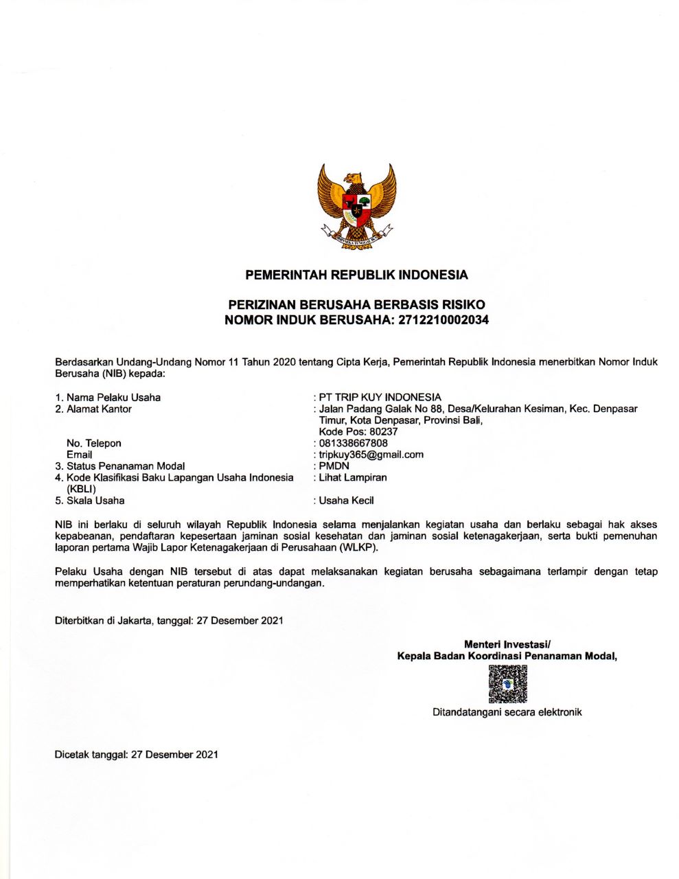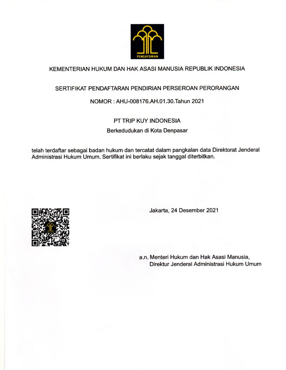 Legalitas PT. TRIP KUY INDONESIA Legalitas PT. TRIP KUY INDONESIA