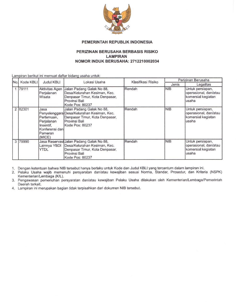 - Kegiatan Usaha : Perjalanan Wisata, Jasa Reservasi dan MICE